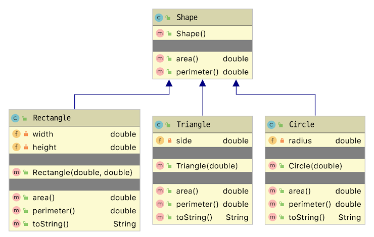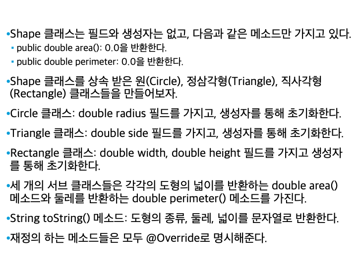 아래의 클래스 다이어그램을 참고하여 도형 관련 클래스들을 만드시오.