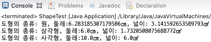 return "도형의 종류: 삼각형, 둘레: " + perimeter() + "㎝" + ", 넓이: " + area() + "㎝";